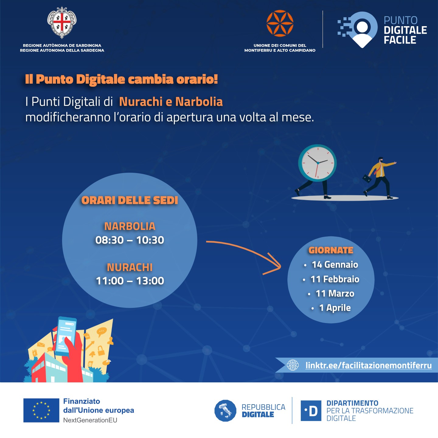 Il Punto Digitale Facile cambia orario! Una volta al mese lo sportello di Nurachi nelle seguenti date programmate: 14 gennaio, 11 febbraio, 11 marzo, 1 aprile seguirà un orario speciale: Nurachi: 11:00 – 13:00