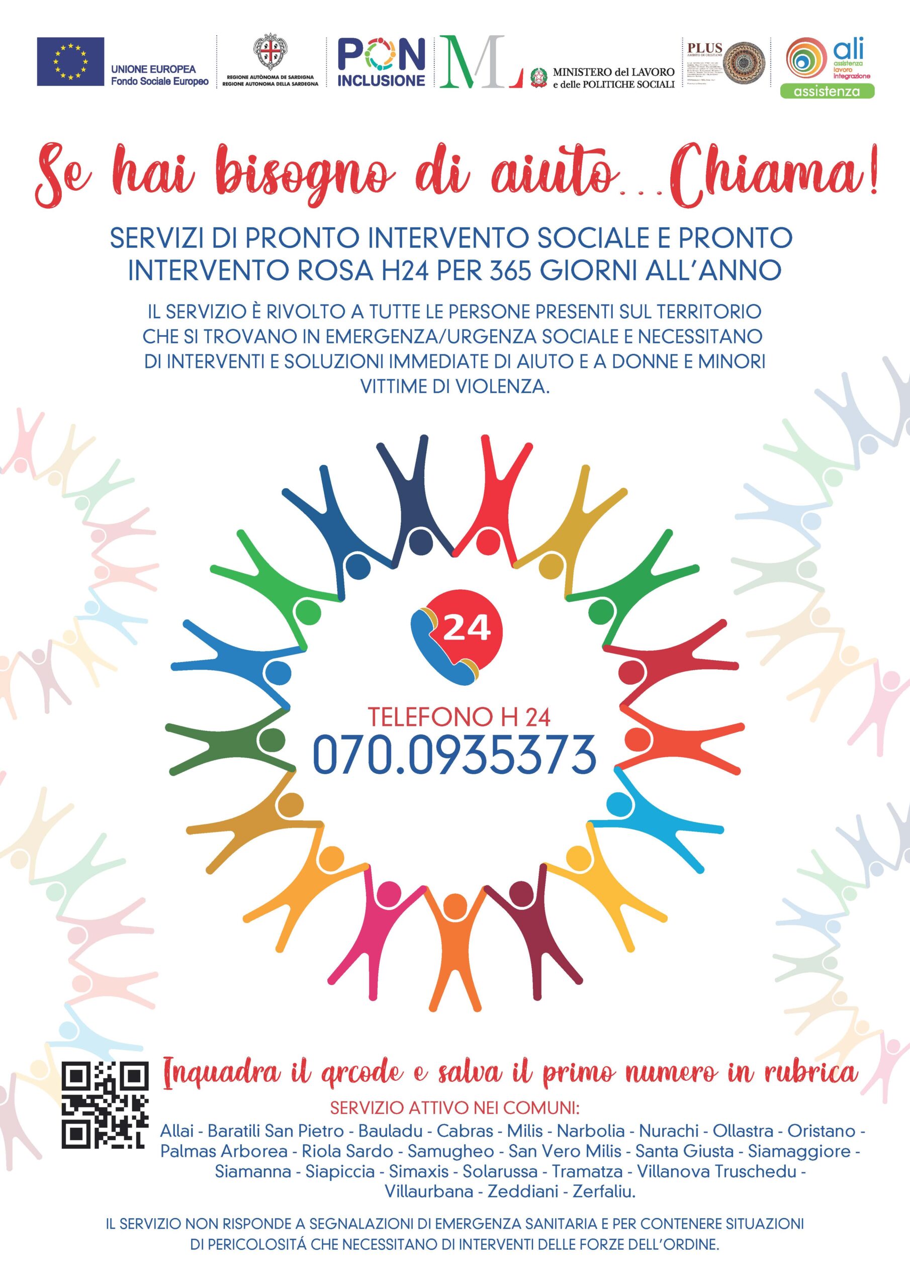 Si avvisano tutti i cittadini che il PLUS Ambito di Oristano ha attivato il SERVIZIO DI PRONTO INTERVENTO SOCIALE E PRONTO INTERVENTO ROSA H24 PER 365 GIORNI L’ANNO.